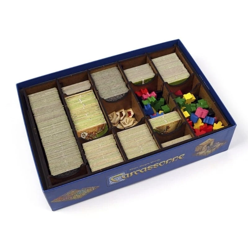 ENG:e-Raptor Insert compatible with Carcassonne is a perfect accessory designed to organize and improve gameplay of the board game. Thanks to this insert you can arrange all game components and keep them in order – no more mess on the table while playing. No more looking for necessary elements during the game. The insert is designed to hold either all Carcassone Big Box components or Carcassonne base game and approximately 4 small expansions.