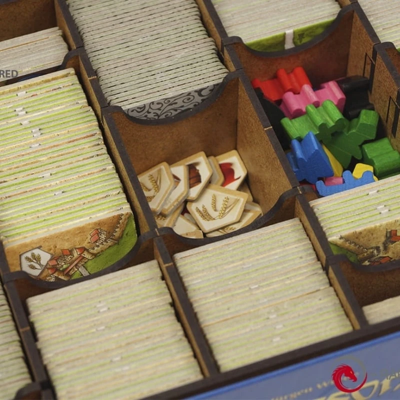 You can hold all your meeples, tiles etc. in one place without being afraid of losing control of the setting. They can be easily accessed and do not take as much space as during the game without an insert. Also, when the box is closed, the components are still kept in order, ready for setting another game quicker then ever before. The insert allows you to put the board and a game manual inside without any issues with closing the box. The insert is durable and made of high quality HDF. To assemble it, there is no glue required. It allows to hold all components inside the box, including board and manual.