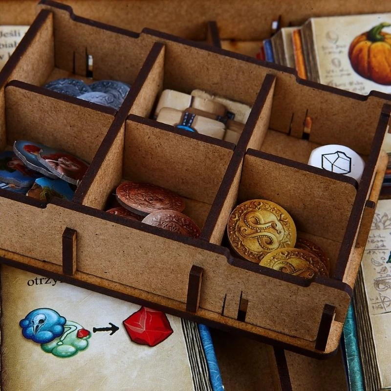 You can hold all your tokens, dices, player markers etc. in one place without being afraid of losing control of the setting. They can be easily accessed and do not take as much space as during the game without an insert. Also, when the box is closed, the components are still kept in order, ready for setting another game quicker than ever before.