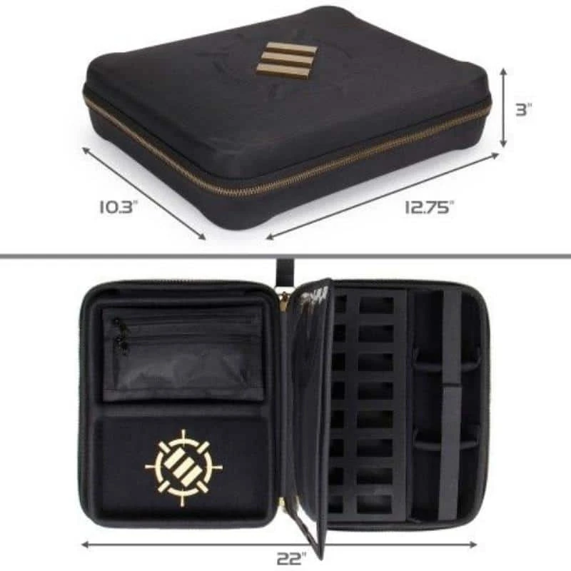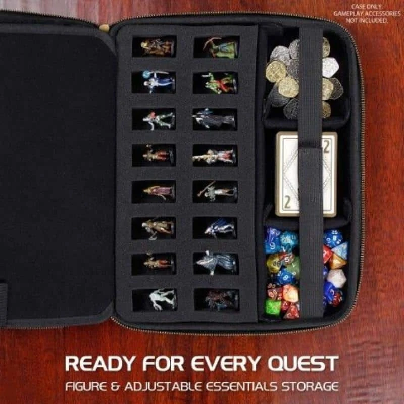 NL: Een alles-in-één opbergkoffer voor RPG-spelers. Beschikt over een uniek ontwerp met aangepaste compartimenten voor dobbelstenen, miniaturen, kaarten en meer. Beschikt ook over twee zijkanten, elk met verschillende compartimenten. De linkerkant heeft een grote lade voor het rollen van dobbelstenen, een verwijderbaar etui voor pennen/accessoires en een extra documentvak achter de lade voor dobbelstenen.