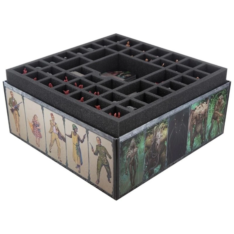 – Offers space for all 42 miniatures and the game material (like tokens, dice and cards) from the core game. Additional space for the contents of the Elder Boxes “Cthulhu” and “Hastur”.