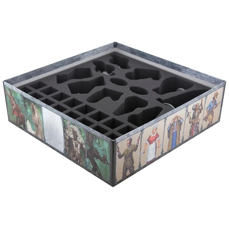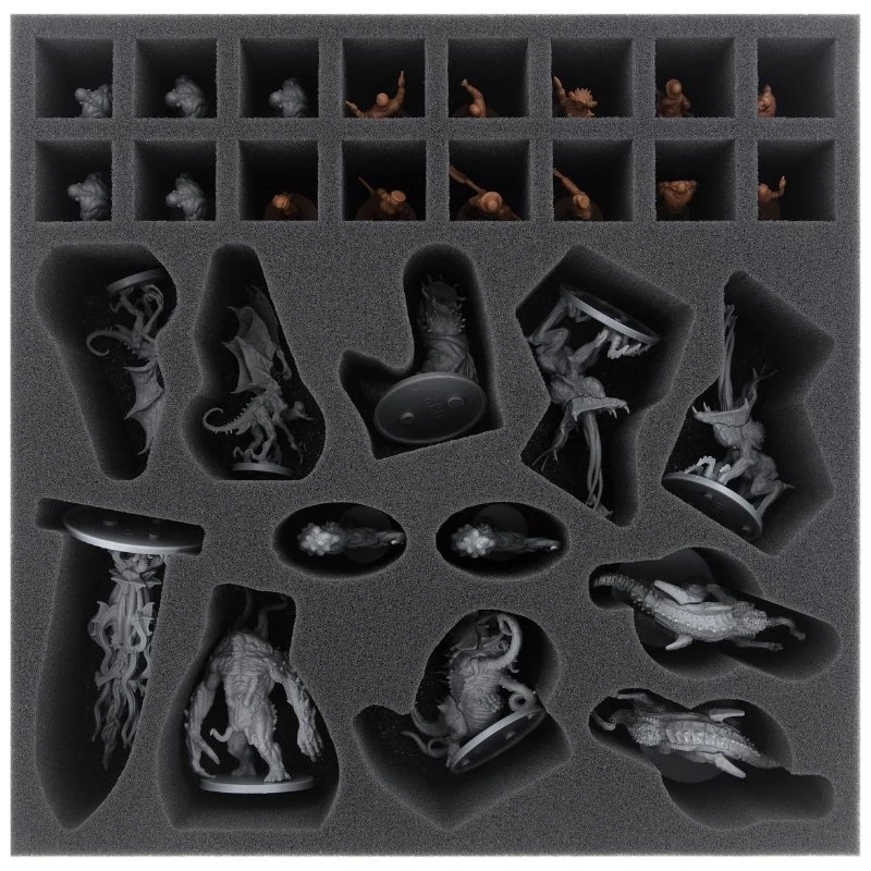 All miniatures from the expansion find their place on the tray in a clearly arranged manner. The large monsters are placed in miniature-precise cut compartments, the smaller ones are placed together with the Investigator figures in the rectangular compartments. The custom-fit cut ensures that the miniatures are optimally protected from damage. Each figure gets its own compartment and is thus completely surrounded by foam. Nothing slips around and the figures stay where they are. If you paint your models, you can be sure that the colors are still unharmed even after transport.