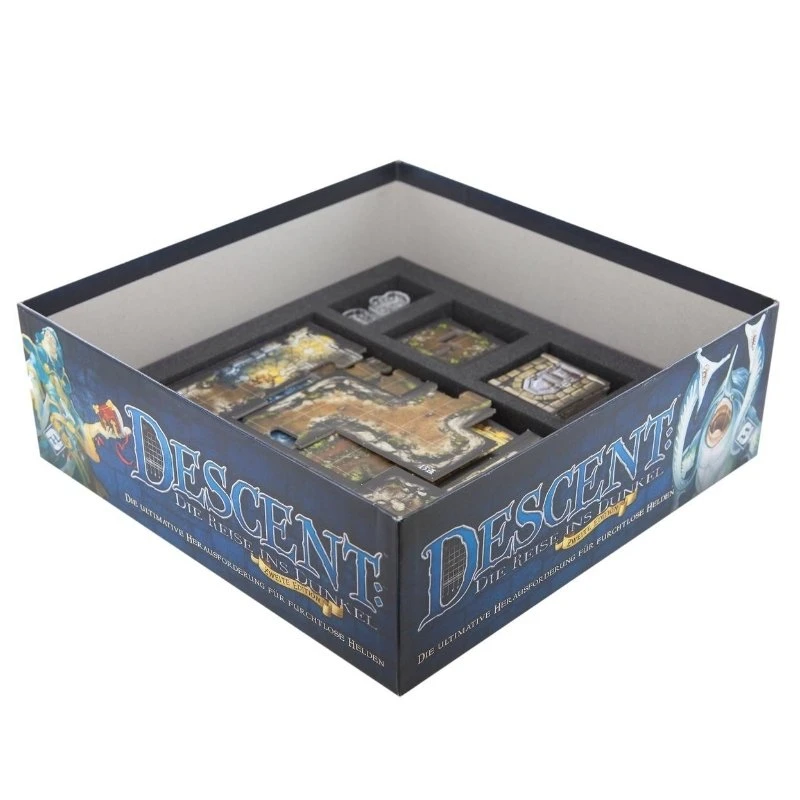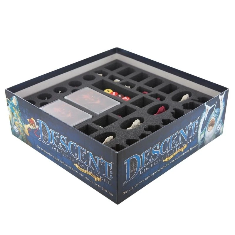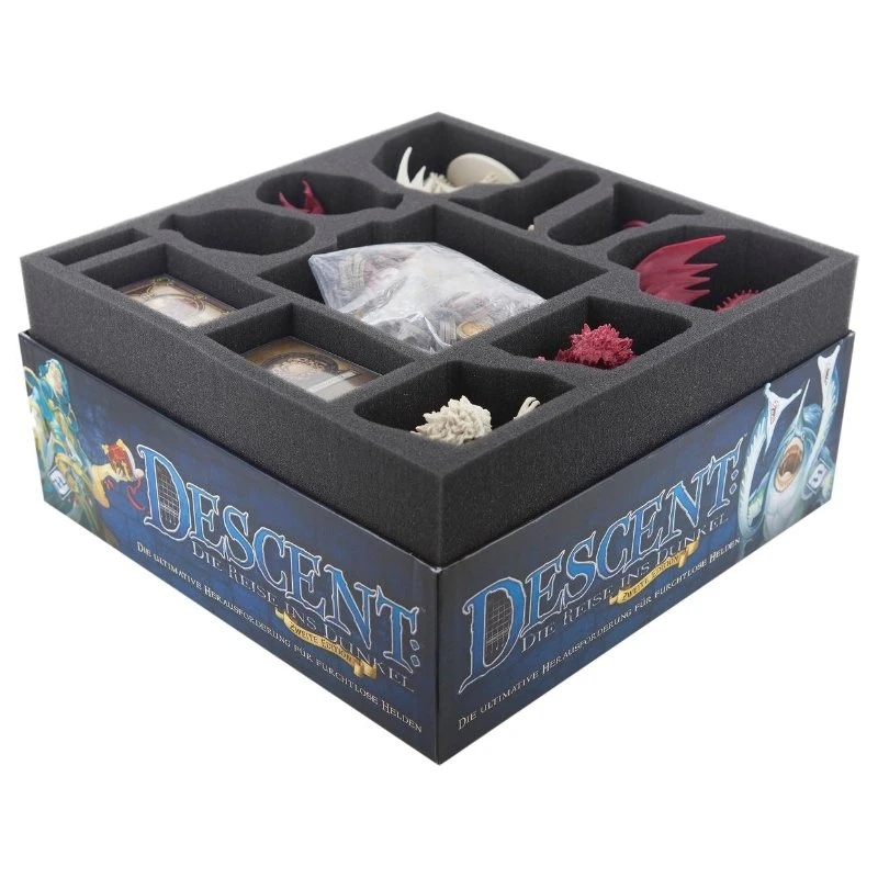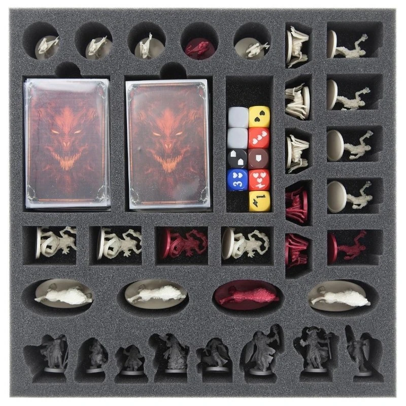 ENG: Hidden in the dark depths of Terrinoth, a power-obsessed overlord gathers an army of horrible creatures. His goal: to subjugate the world of the living. A small group of brave heroes becomes the last hope of the free peoples. And so they descend into the darkness to face evil before the world sinks into chaos and ruin. An epic fantasy board game that is unparalleled. And a wealth of detailed game material that requires clear and safe storage. To prevent you from drowning in chaos with the game material, we have developed foam tray set for the original Descent: Journeys in the Dark Second Edition board game box.