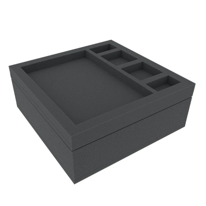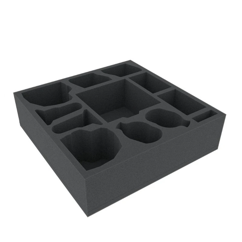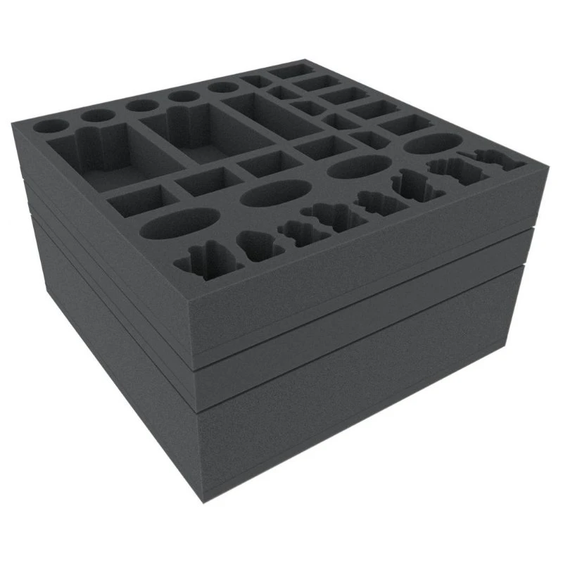 The set consists of three foam trays (dimensions: 285 mm x 285 mm and 40 mm, 70 mm and 30 mm height) and one foam topper. We do only use high-quality, chlorine- and acid-free foam as material. The mats are divided into individual compartments in which miniatures and game components can be sorted quickly and easily. The miniature adjusted cutting of the compartments prevents the more sensitive parts, such as weapons, claws or wings from bending. The separation of the figures by foam dividers provides optimal protection for painted figures and protects the colors from flaking off.