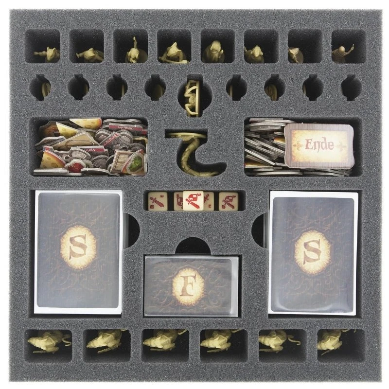 ENG: This foam tray is especially designed for Mice and Mystics. In the foam you can not only protect and transport your material of the original game box but also the equipment of the Heart of Glorm expansion. In the 30 compartments you can stow your mouse and enemy figures, the different cards in sleeves, tokens and dice in shaped cut outs. The mat fits in the original game box. Along with the Rule Book, Story Book, Story Control Board and Room Tiles the foam extends slightly over the edge of the board game box.