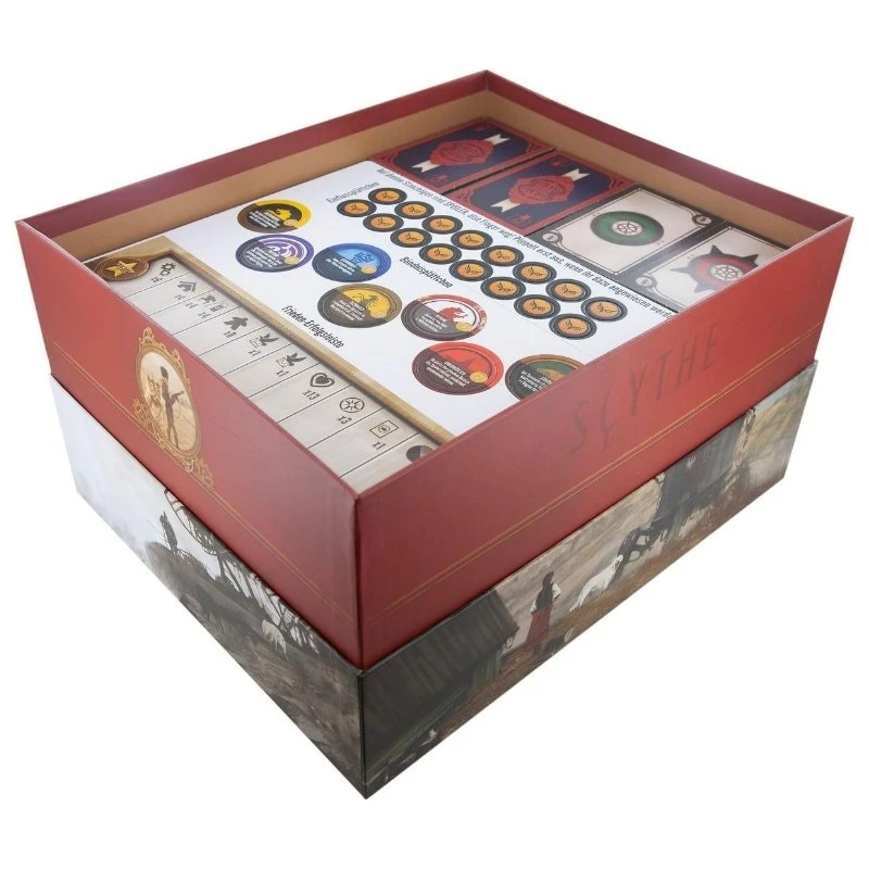 ENG: With the last release of the expansion trilogy, ‘The Rise of Fenris’, your Scythe collection is finally complete. So that you don’t lose track of all the figures, tokens, meeples and cards, and to store everything in the large Legendary Box, we have the right foam set for you here.