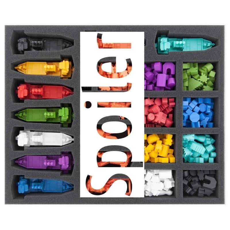 In closing, the matching foam topper ensures that the contents of the upper mat are completely surrounded by foam. You can place the larger cardboard parts, the rulebooks, game sheets and the game board on the topper. Hereby, all plastic miniatures, wooden parts, cards and other game accessories are neatly and securely stowed away. The clearly arranged storage allows you to keep an overview at all times, saves time when setting up the game and no token gets lost.