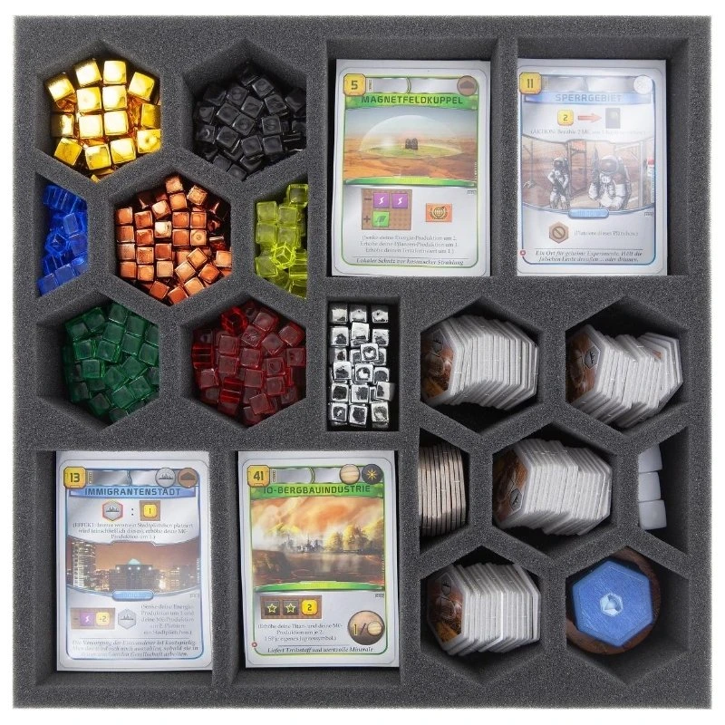 A total of 19 compartments on the Feldherr foam insert make sure that each marker and each tile is properly placed. 8 compartments are available for sorting the resource cubes and player markers. You have one compartment for each color and thus always keep the overview. In the group with the hexagonal compartments on the opposite side you have space for the tiles. Hereby, the ocean, greenery, city, and special tiles are neatly and securely stowed so that the game can be set up quickly and easily. The temperature, oxygen, and generation markers, along with the first player marker, also find room here.