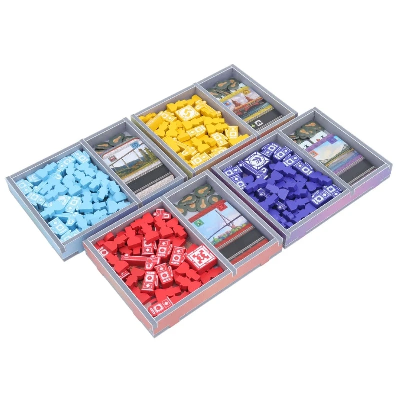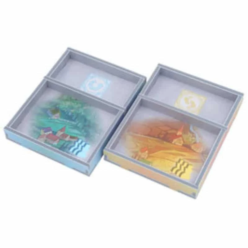 Every tray includes images from the rulebook or game cards and boards. Each player tray has a scene from the game board in the player colour.