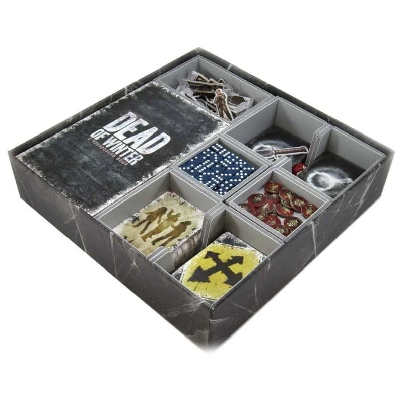 This insert is designed to be compatible with Dead of Winter®. The same insert is also compatible with The Long Night®. The design provides both efficient storage and improved game play. Many of the trays can be utilised during the game, and they greatly aid set-up and clear-away times. There is space for all cards to be sleeved.