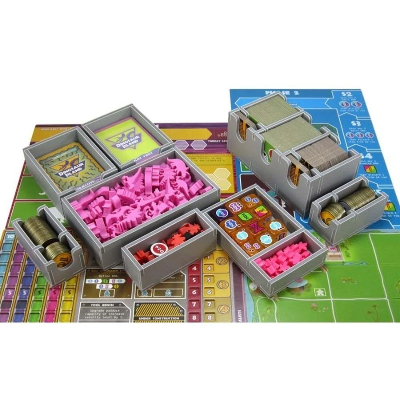 Insert compatible with Dinosaur Island Extreme Edition®. The design provides both efficient storage and improved game play. Many of the trays can be utilised during the game, and they greatly aid set-up and clear-away times. The rules and boards act as a lid on top of the trays. This same insert also works with the Totally Liquid Extreme Edition® expansion, for which we have created a separate product page. If you own both sets you will need two inserts to store them.