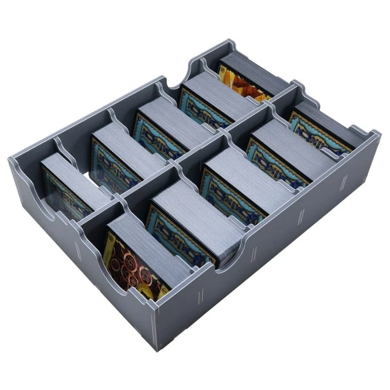 ENG: Official insert compatible with Dominion®,with space for 1,100 sleeved or 1,850 unsleeved cards. The design provides both efficient storage and improved game play, with removable token trays for use during the game. The rule books act as a lid on top of the trays. The trays are arranged in up to three layers, with the main part of the insert taken up by a large card tray. Both the card trays have space for sleeved cards. The insert can be placed in either the base game box or any of the large expansion boxes. It also has two different layouts depending on whether you need more token storage or more game mats.