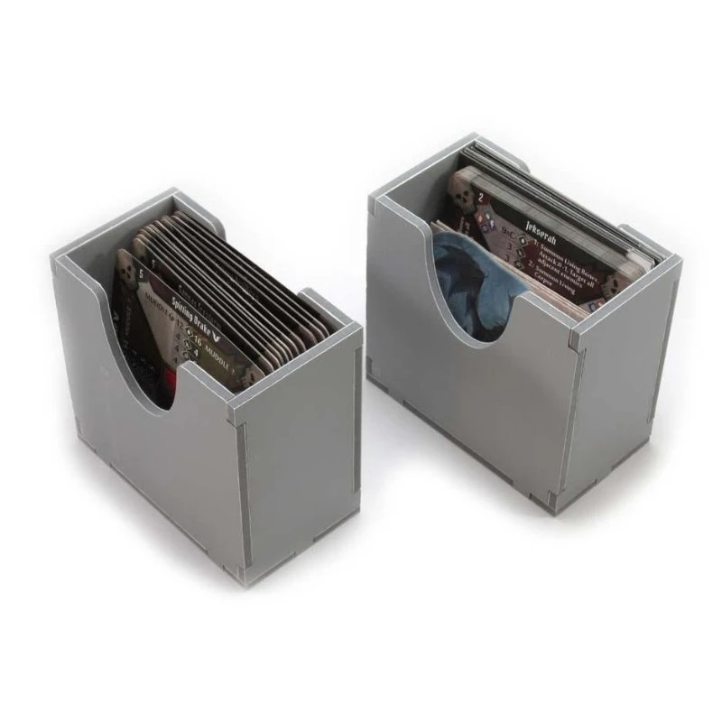 This insert is designed to be compatible with Gloomhaven®. The design provides both efficient storage and improved game play. Many of the trays can be utilised during the game, and they greatly aid set-up and clear-away times. There is space for all cards to be sleeved.