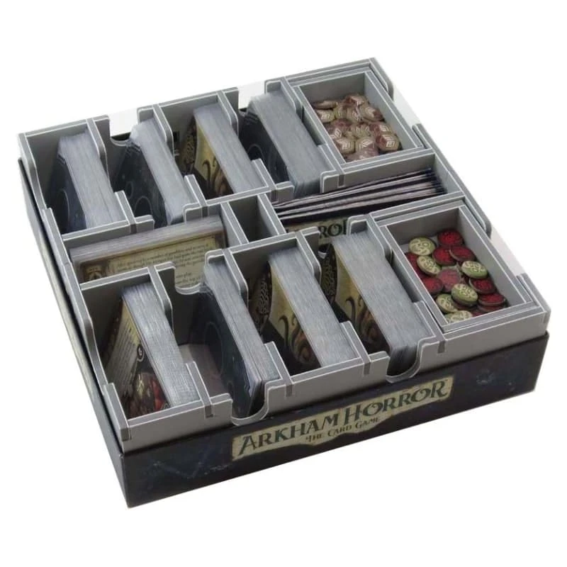 ENG: Insert compatible with the new smaller standard of Living Card Games® with boxes sized 25.4 x 25.4 x 5.1 cm. Such games include Arkham Horror: The Card Game®, A Game of Thrones: The Card Game (2nd Edition)®, Legend of the Five Rings: The Card Game®, and Android: Netrunner The Card Game® The Revised Core Set, The Lord of the Rings: The Card Game (2nd edition)® as well as with Blood Bowl Team Manager®. Please check the detailed product pages for each of these games. The insert is designed to fit snugly inside the box, and is 2.5 cm higher than the box base to allow for maximum storage of cards. There is space for all cards to be sleeved with quality sleeves. Here you can see the box loaded with roughly half its total capacity of cards.