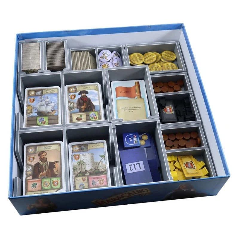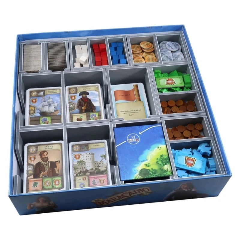 Insert compatible with Maracaibo®, and La Armada® expansion. The design provides both efficient storage and improved game play. Many of the trays can be utilised during the game, and they greatly aid set-up and clear-away times. The insert is arranged in two layers, and some of the trays can be placed directly onto the game board during game play. This is the second layer of trays. Note that the two largest legacy tiles (numbers L3 & L4) are placed on top of their tray, with the remaining smaller tiles underneath as shown here.