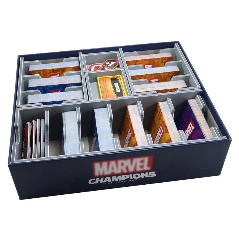Insert compatible with Marvel Champions: The Card Game®, with space for over 900 sleeved or 1,400 unsleeved cards. The design provides both efficient storage and improved game play. Many of the trays can be utilised during the game, and they greatly aid set-up and clear-away times. The rules act as a lid on top of the trays. The insert has space for numerous expansion packs. The token trays are arranged in three layers as shown here.