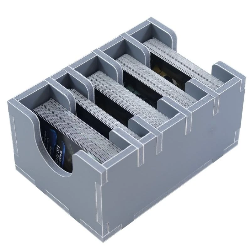 The card door tiles can be stored with their bases attached.The insert includes one standard sized card tray and one mini card tray . Both trays have space for sleeved cards. As there are many types of cards for the game we have added here keys to each of the card tray images so you can see which type goes where. When packing away the game, first place the game board on top of the trays. Then add the rule books on top. This fills the box to the top and allows for vertical storage, as well as easy transport of the game.