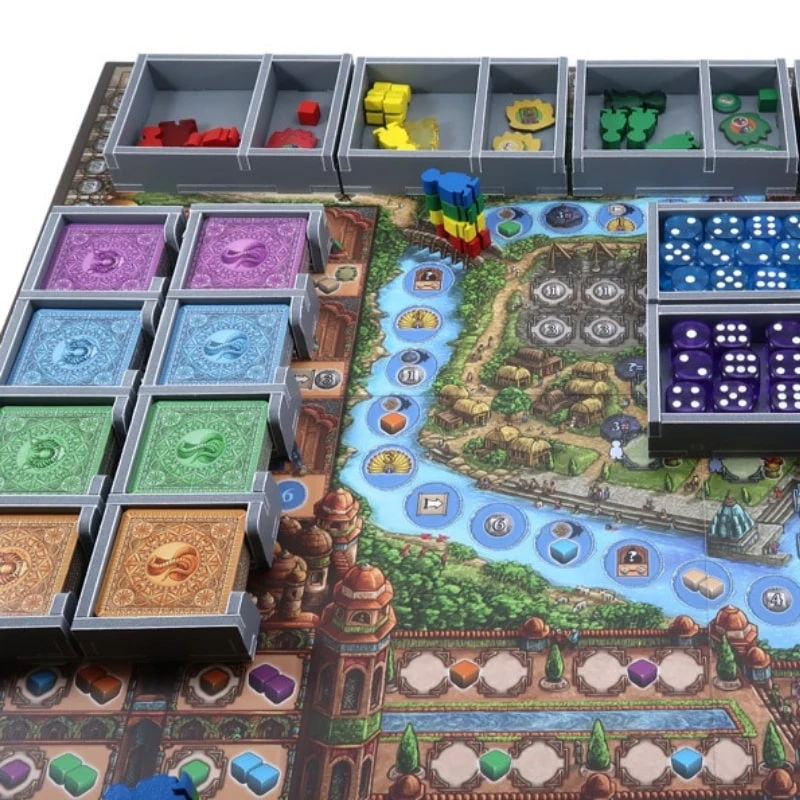 ENG: Insert compatible with Rajas of the Ganges®, including the Goodie Boxes 1 & 2 expansions. The design provides both efficient storage and improved game play. Many of the trays can be utilised during the game, and they greatly aid set-up and clear-away times. The rules and boards act as a lid on top of the trays.