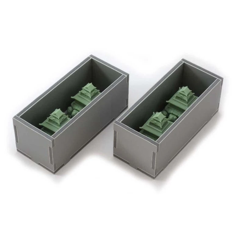 Insert compatible with Rising Sun®, both the retail and the Kickstarter editions. The design provides both efficient storage and improved game play. Many of the trays can be utilised during the game, and they greatly aid set-up and clear-away times. The rules and boards act as a lid on top of the trays. Here you can see the top layer of trays. The insert is designed to store all the Kickstarter version add-ons, as can be seen below. Note: While this insert does provide for vertical storage, the game contains many miniatures with protruding weapons that are liable to bend. We recommend for this reason to store the game horizontally.