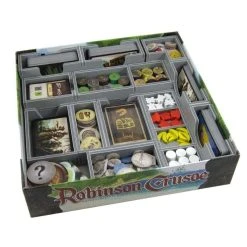 Insert compatible with Robinson Crusoe® and the Voyage of the Beagle Vol. 1 ® expansion. The design provides both efficient storage and improved game play. The trays can be utilised during the game, and they greatly aid set-up and clear-away times. The rules and boards act as a lid on top of the trays. The insert is arranged in two layers as shown. Note that the island hexagon tiles and first player token are stored in between the other trays at the bottom of the image.