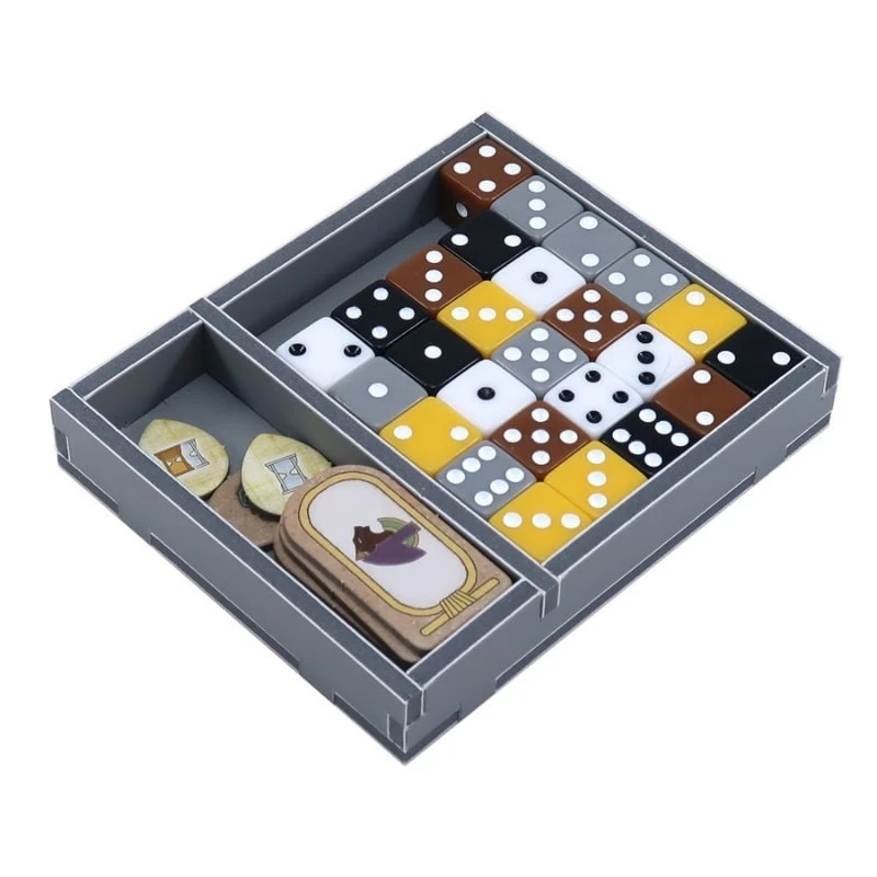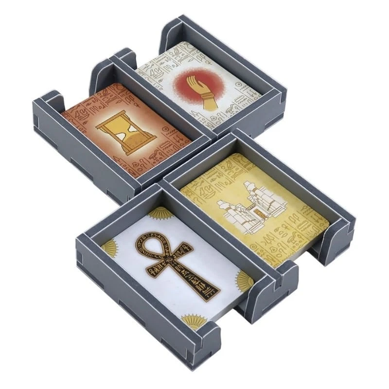 ENG: Insert compatible with Tekhenu: Obelisk of the Sun®.The design provides both efficient storage and improved game play. Many of the trays can be utilised during the game, and they greatly aid set-up and clear-away times. The insert is arranged in up to three layers. Note that the obelisk is place proudly in the center of the trays, with the cloth bag rolled up underneath. The two lower layers can be seen below. These are the trays from the insert. All component types are split by type organising all the game components. There is space for all cards to be sleeved.
