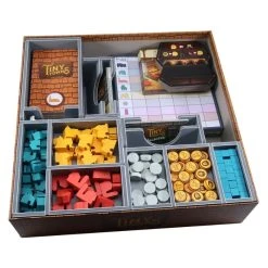 ENG: Insert compatible with Tiny Towns®, including Villagers®, Fortune® and Tiny Trees® expansions. The design provides both efficient storage and improved game play. All of the trays can be utilised during the game, and they greatly aid set-up and clear-away times. The trays are arranged in up to three layers. Note that the player boards, score pads and other tiles are stored together at the top right of the images. The wooden master builder hammer is placed at one of end of the larger card tray.