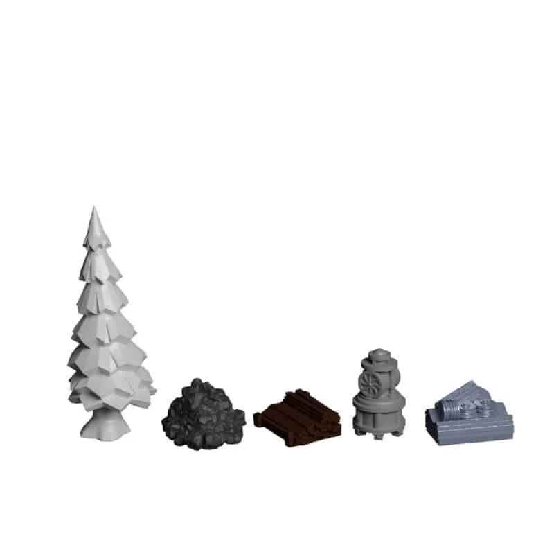 NL: Deze set plastic grondstoffen komt qua schaal overeen met andere plastic componenten in het spel. Het verbetert gewoon de algehele indruk die je krijgt als je de Miniatures-uitbreiding hebt. Net als de speelmat is deze add-on puur van esthetische aard en heeft het op geen enkele manier invloed op de mechanismen van het spel. Ook moet je nog steeds de houten kolenstukken gebruiken voor de Generator.
