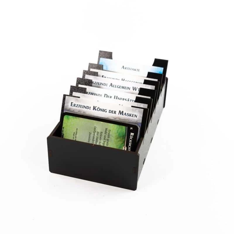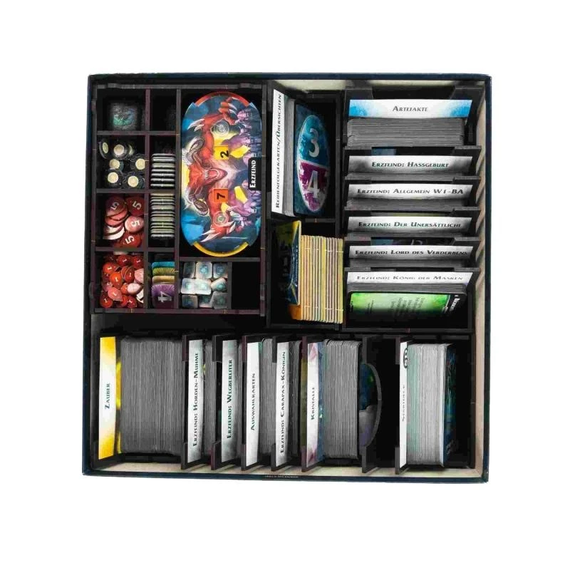 The innovative plug-in system in elegant, timeless black does completely without annoying glue, complicated screws or idle nails. It conveniently snaps together and fits precisely, yet visually appealing, into the game box so that all components, whether miniatures, tokens, dice or even sleeved cards, can be safely stowed and protected, transported and stored.
