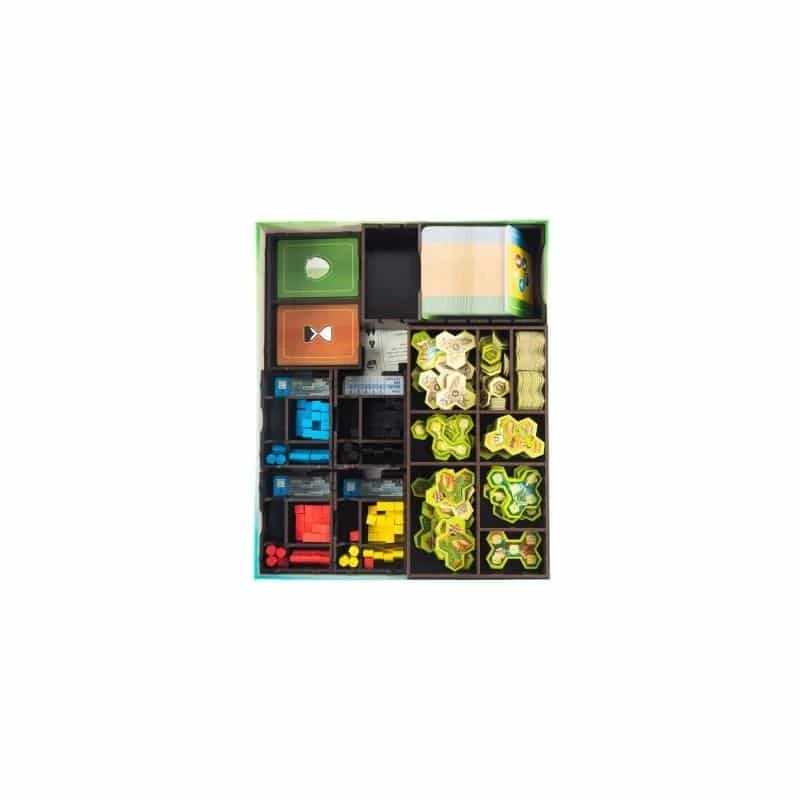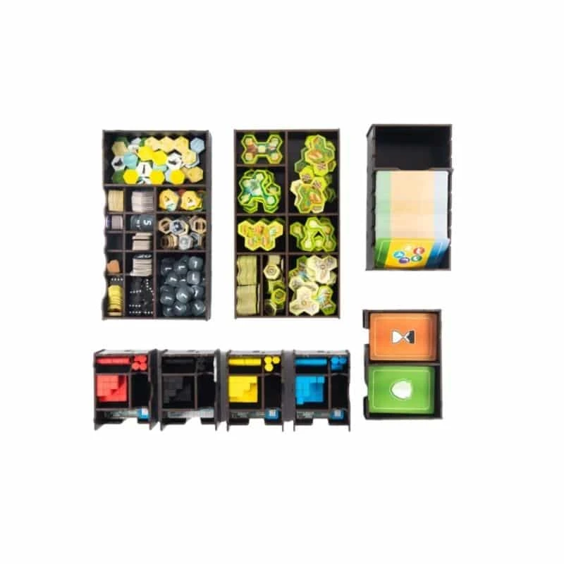 The innovative plug-in system in elegant, timeless black does completely without annoying glue, complicated screws or idle nails. It conveniently snaps together and fits precisely, yet visually appealing, into the game box so that all components, whether miniatures, tokens, dice or even sleeved cards, can be safely stowed and protected, transported and stored.
