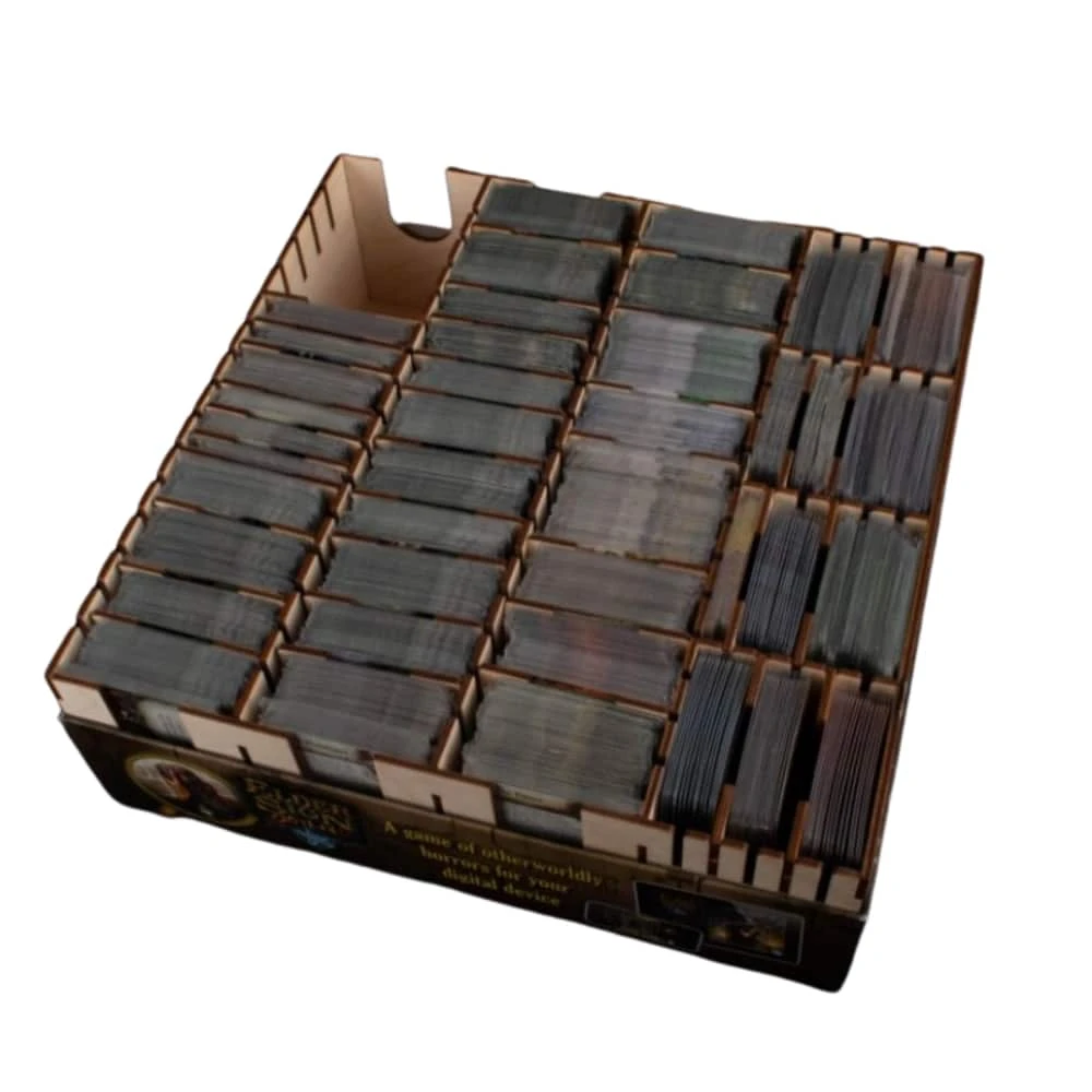ENG: Across the globe, ancient evil is stirring. Now, you and your trusted circle of colleagues must travel around the world, working against all odds to hold back the approaching horror. This organizer was designed to hold Eldritch Horror by Fantasy Flight Games and all available expansions in four original game boxes. It features various card trays, token trays for quick setup and easy access during game.