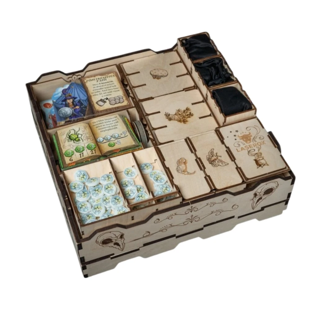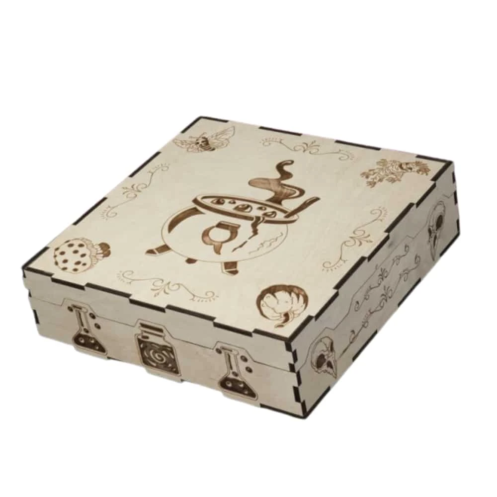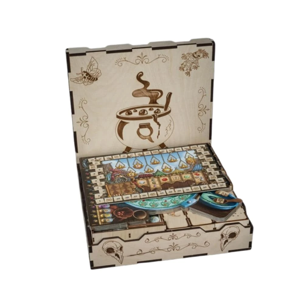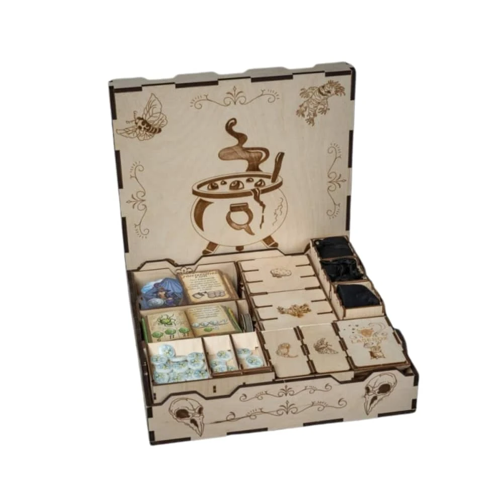 To store all your potionmaking equipment in a stylish way, we designed the Quacks Big Box, a beautifully designed wooden crate that is compatible with our game organizer, thus giving a new home for the game and its several expansions.