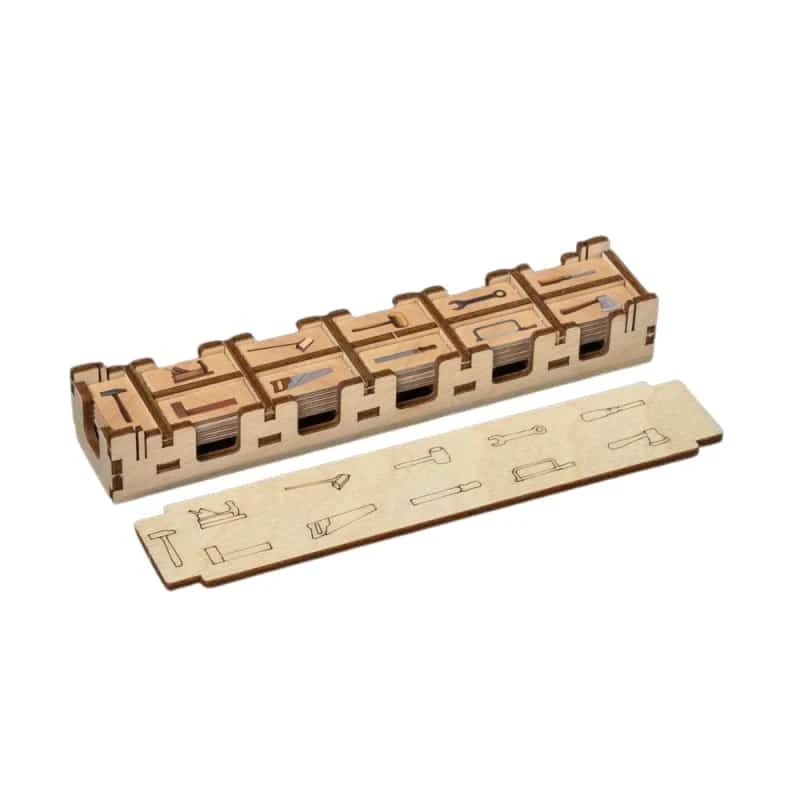 With woodworking being the main craft of Laserox, we did not hesitate to get ourselves a copy of this game once it popped up on the market, and after a few test plays, it was no question that it deserves a nice wooden organizer. Taking some inspiration from the tools in our own woodworking workshop, we designed an organizer to hold all game components neat and tidy within the gamebox and to also be functional during gameplay. Keep your personal player accessories in your own toolbox, while keeping all other game components in their designated containers without scattering the gametable. Each container is richly decorated to enhance its wooden nature and to echo the theme of the game.