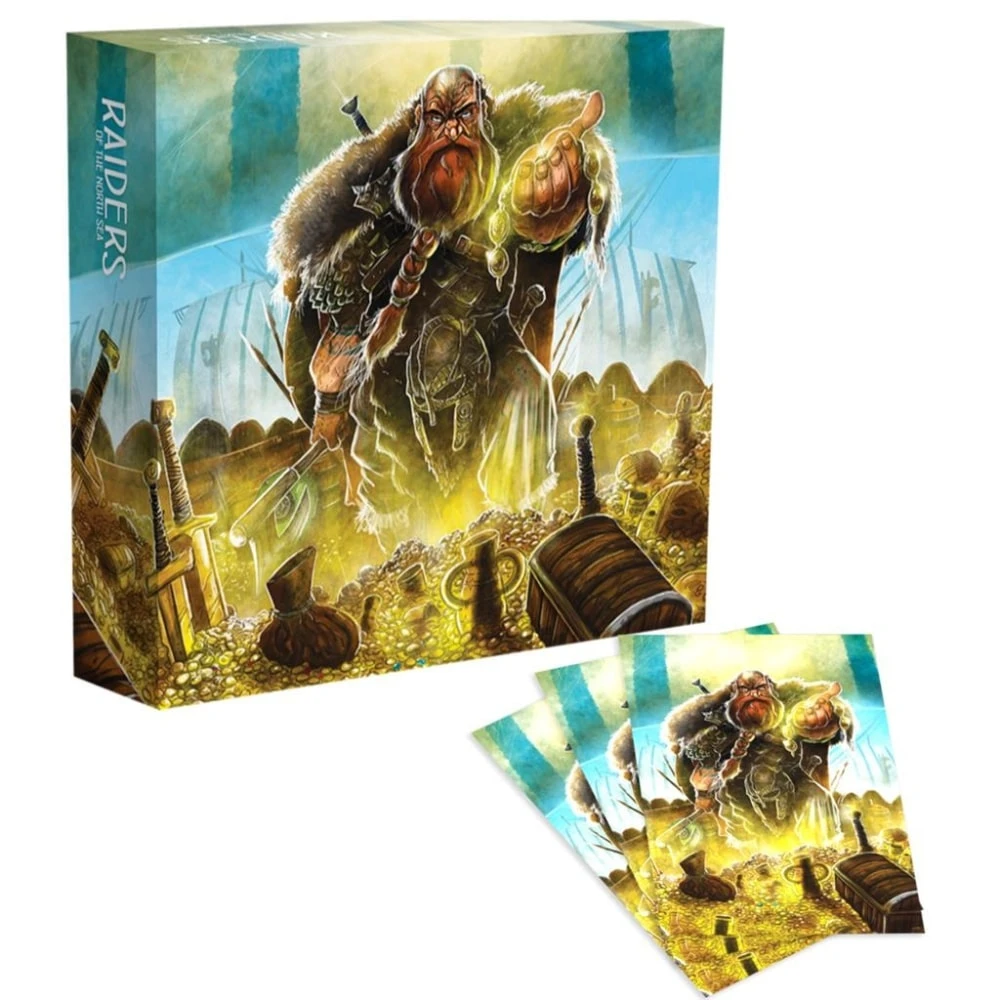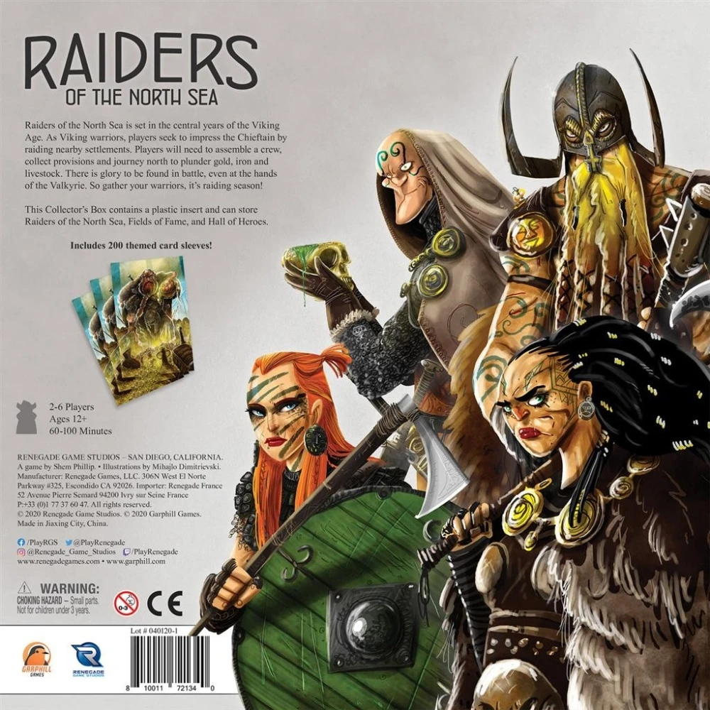 ENG: Raiders of the North Sea: Collector’s Box contains a plastic insert that can store Raiders of the North Sea, Fields of Fame, and Hall of Heroes as well as 200 themed card sleeves.
