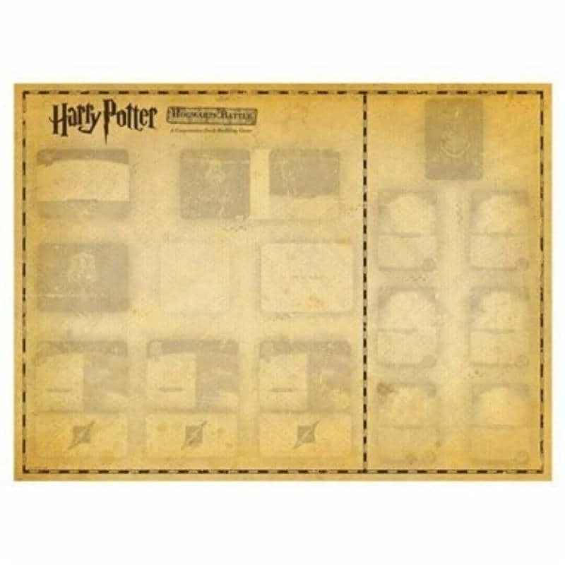 ENG: Organize everything you need on the journey to vanquish Lord Voldemort with the Harry Potter Hogwarts Battle Playmat! This flexible, reusable mat replaces the game board from the cooperative deck-building core game for a sturdier setup, playthrough, and clean-up experience, box after box! Begin every game and expansion with your cards right where they belong to go into battle with the preparedness of the best Hogwarts Heroes!